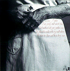 ![]() ![]() Silver gelatin photographic prints, silk thread. Each image 16in x 16in. 1989-90. Sewn Diptych takes verses adapted from Victorian samplers, and sews them through photographic prints, puncturing the smooth surface. In the first image, the cross-stitches sew the lips of the child together. The work is part of a larger body of work concerning women and textiles, and reflects an ambivalance of the role of textiles as both a creative and oppressive part of women's lives. The work was shown in The Subversive Stitch - Contemporary political textile art, a Cornerhouse touring exhibition. It is also the colour front cover image for New Feminist Art Criticism (Kathy Deepwell (ed.) (1995). Manchester and New York, Manchester University Press.)