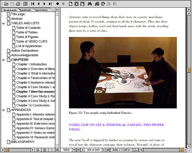 Beryl Graham's (1997) thesis is basically a conventional written thesis, with black and white images, but the document also includes an exhibition catalogue as an appendix, and a CD-ROM which contains a PDF version of the thesis (with colour images instead of black and white, and short video clips where relevant). PDF stands for Portable Document Format, and are made via Adobe Acrobat software. It is fairly simple to make PDF files from existing Word or HTML (web) files, and like HTML, is one of the simpler ways of combining words, images, video and hot-links or hypertext. They retain the correct layout and type styles so that they can be printed out correctly, which is useful because it is very difficult to read a sustained length of text from a computer screen. PDF files can include ready-made contents pages and word-search functions, and can be put on the Internet. |