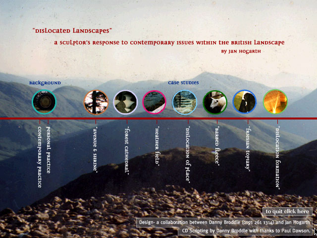 Jan Hogarth (1999) worked with a multimedia design student to create the multimedia CD-ROM element of her thesis (which also included a paper element). The multimedia is mostly a descriptive analysis of her series of seven artworks, with some references to background and contextual work by other artists. It uses some links between related sections, but doesn't use hypertext extensively. The paper element included pages from her artist's sketchbook, which combine drawings, photos and text (low-tech multimedia?) Making multimedia with software such as Director demands a higher level of knowledge than PDF or HTML, but enables some more sophisticated visual effects. |