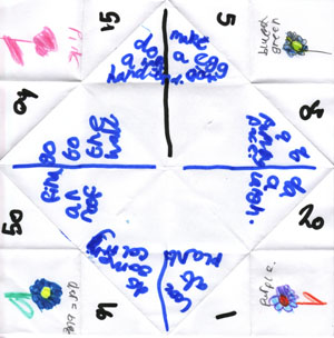 Beryl's art games: Rochdale workshop Contents: This game home page About this game (international) How to make and play (with links) Beryl's games Others' games Beryl home page < Back to others' games home Next others' game > Game by Zahra. Sample fortunes: Go to the wall. Do a laugh.